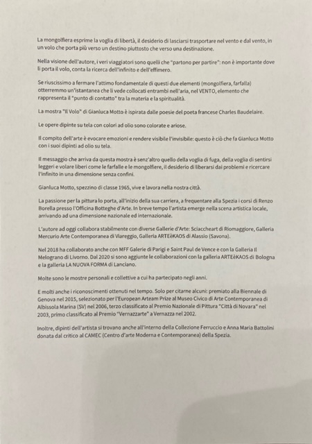 Vuonna 1965 syntynyt Gianluca Motto asuu ja työskentelee La Spezian kaupungissa Italian Liguriassa. Värikylläiset, ilmavat öljyvärimaalaukset ovat runollisen kauniita. Niiden inspiraation lähde onkin ollut ranskalaisen Charles Baudelairen runot. Teosten perhoset ja kuumailmapallot symboloivat irti päästämistä ja vapautta – vaikeita asioita kaiken kauneuden keskellä. Taiteilijan viesti on: irti päästäminen kannattaa, palkkiona on vapaus.